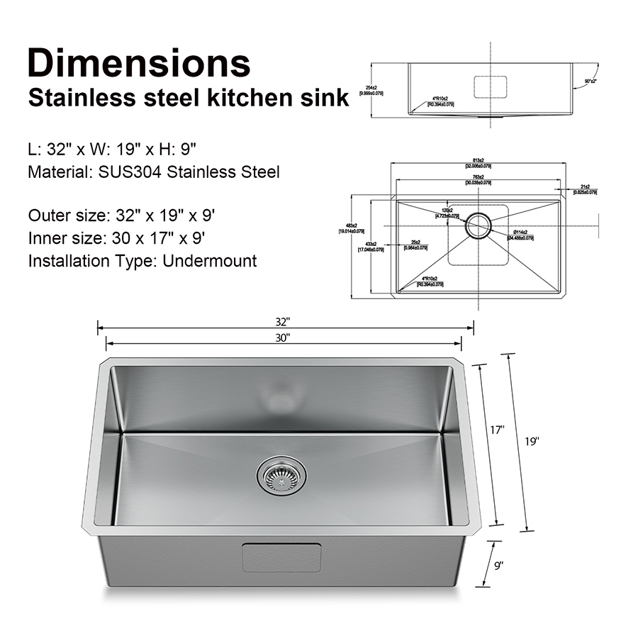 32×19 Inch Undermount Sink