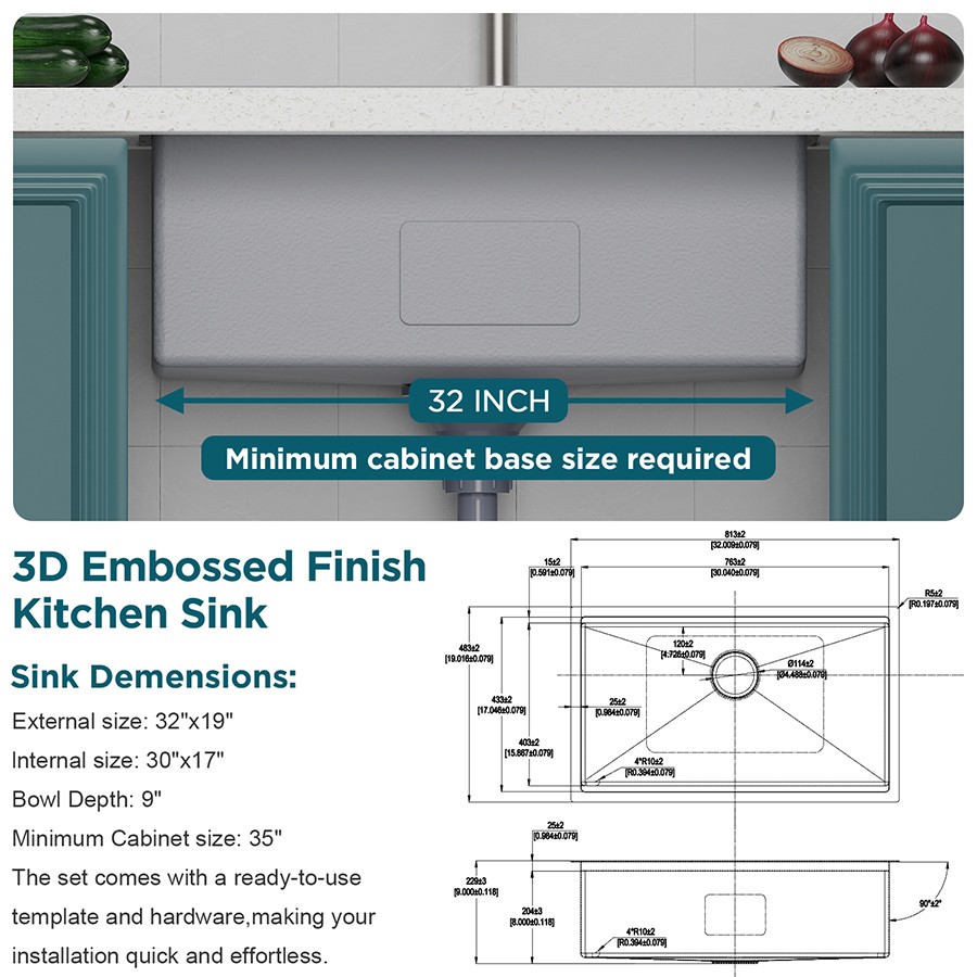 32×19 Inch 3D Embossed Surface Finish Sink